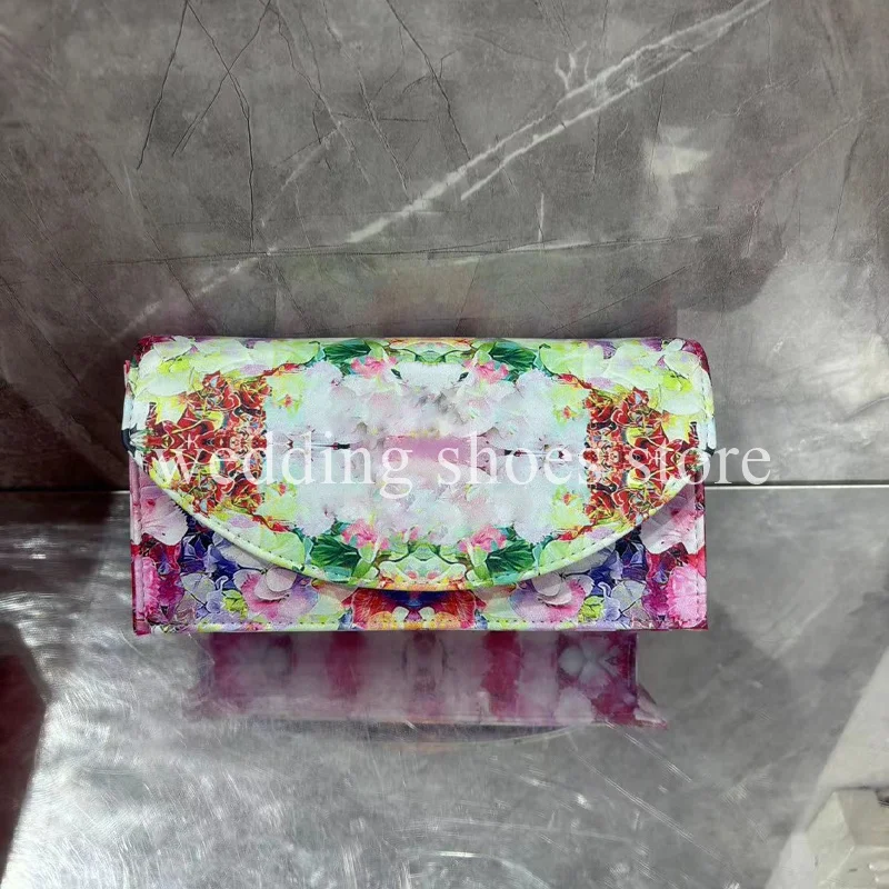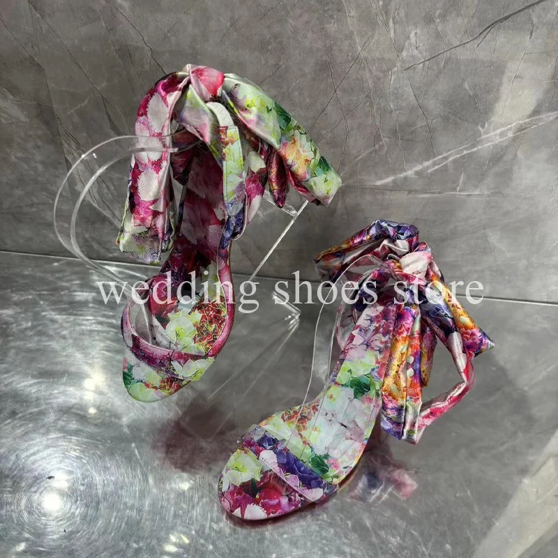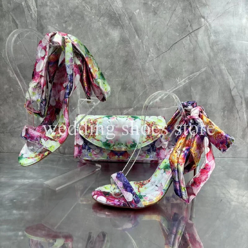 Fashion Colourful Flowers Printed Lace-up High Heels Sexy Bowknot Ankle Strap Women Summer Wedding Party Sandals Bag Shoes